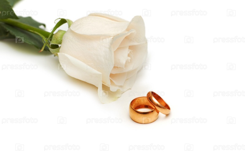 Белая роза и обручальные кольца на белом фоне