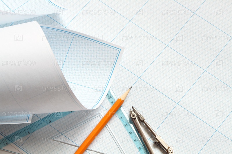 Циркуль, карандаш и линейка на разлинованной бумаге