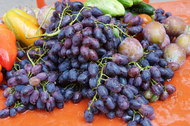Лоза винограда и другие овощи и фрукты на оранжевом столе