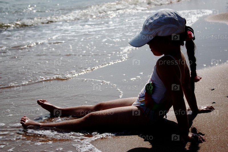 Маленькая девочка сидит на песке у воды