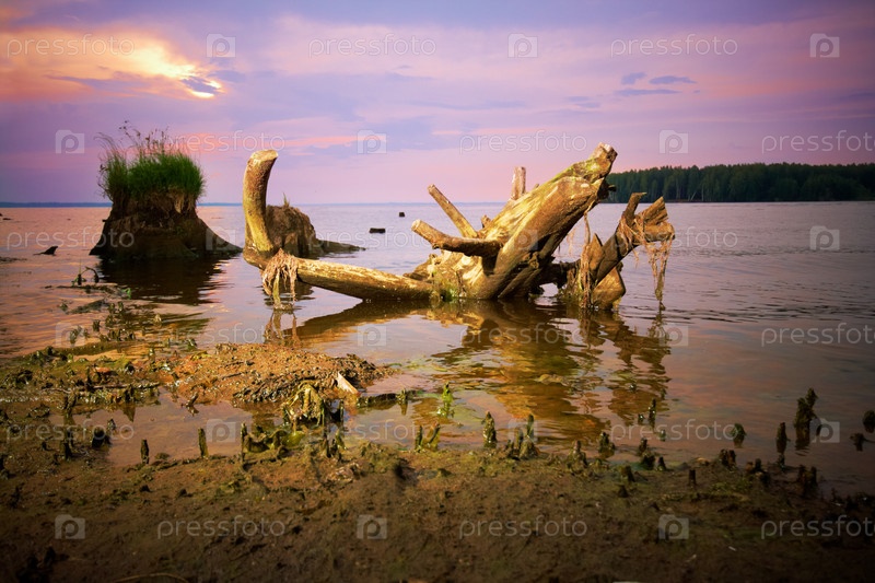 Засохшее дерево в воде на фоне заката