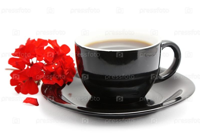 Кофе в чашке с блюдцем, красный цветок на белом фоне