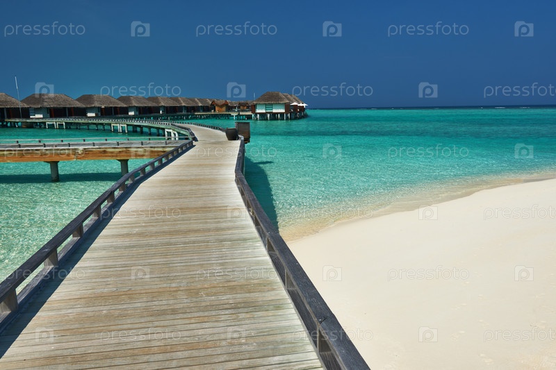 Красивый пляж с бунгало на воде
