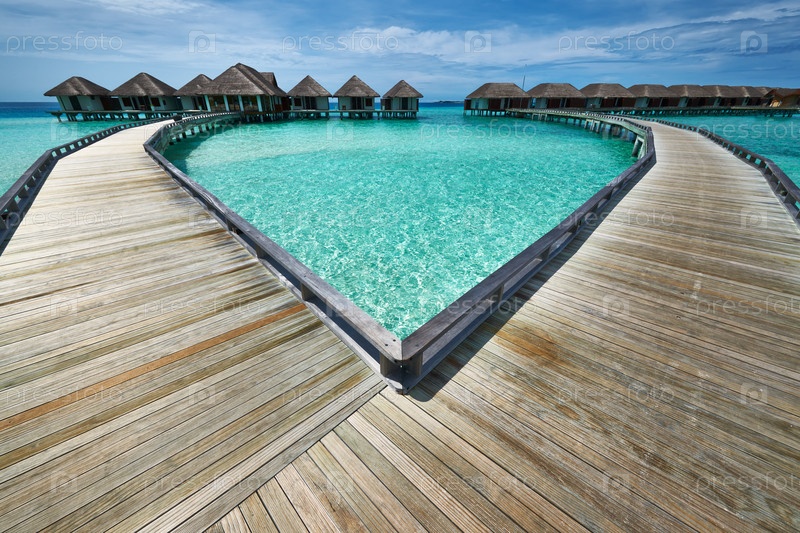 Красивый пляж с водными бунгало