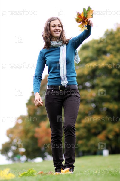 Девушка разбрасывает пожелтевшие листья