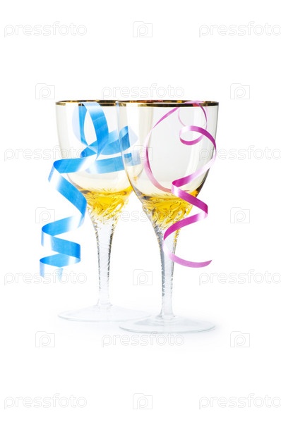 Бутылка вина и стакан с стримером на белом