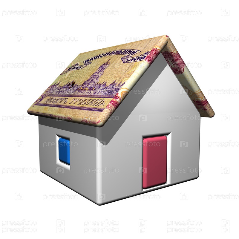 Небольшой одноэтажный дом в украинских гривнах, 3d, белый фон
