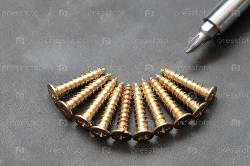 Саморезы и отвертка крупным планом на сером фоне