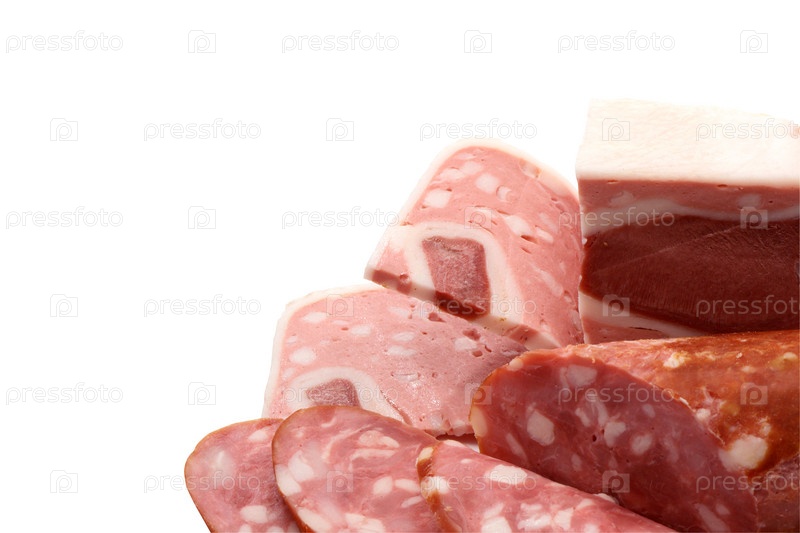 Нарезанная колбаса крупным планом на белом фоне