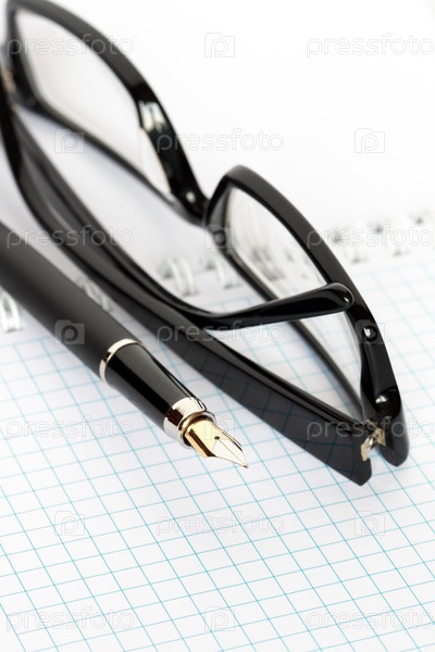 Черные очки и перо и тетрадь в клеточку крупным планом