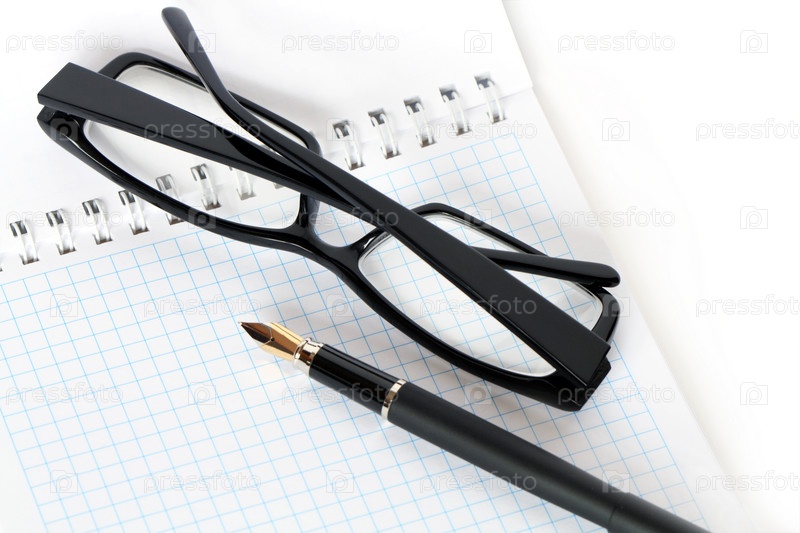 Черные очки, перо и тетрадь в клеточку крупным планом