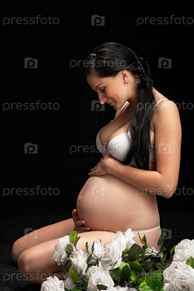 Беременная женщина с белыми розами на черном фоне