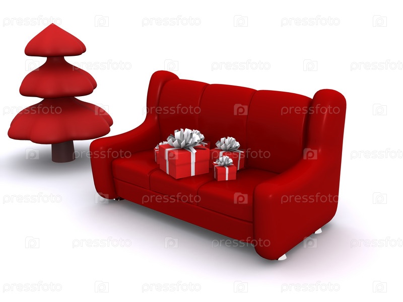 Подарочные коробки на диване, елка, 3D