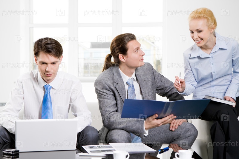 Изображение исполнительных сотрудников, консультирующихся о новом проекте, в то время как бизнесмен печатает на ноутбуке