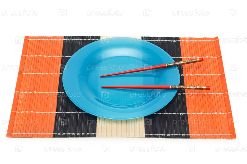 Голубая тарелка с палочками для еды на бамбуковой циновке