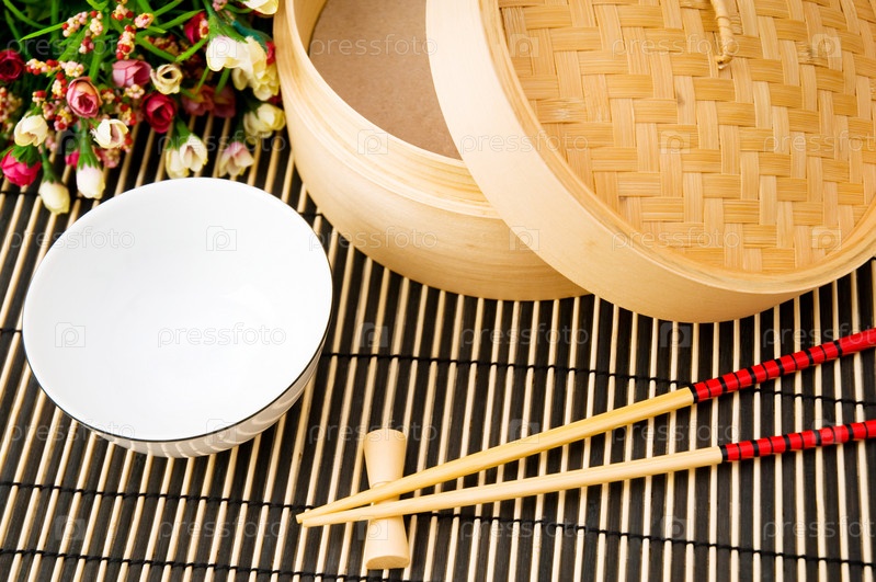 Палочки и чаша на бамбуковом коврике