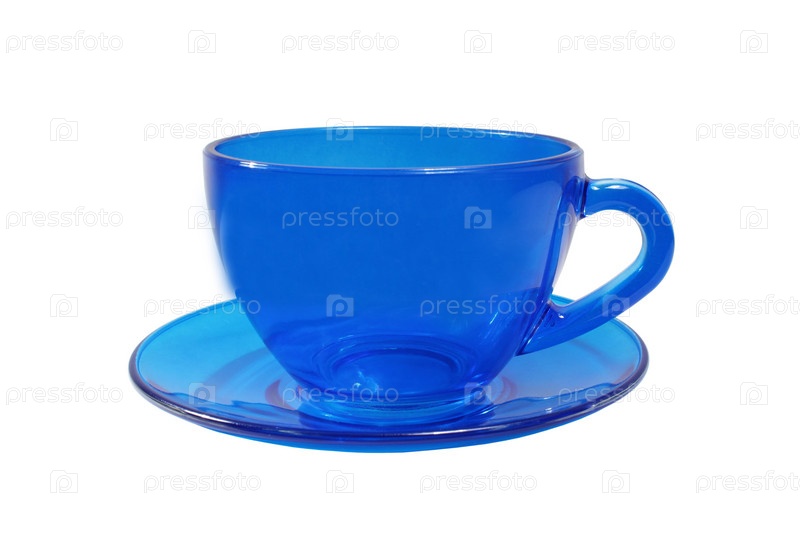 Голубая стеклянная чашка и блюдце на белом фоне
