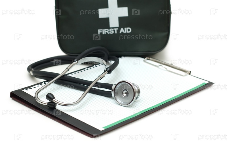 Аптечка первой помощи, стетоскоп и планшет с бумагой