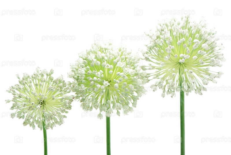 Три соцветия чеснока на белом фоне