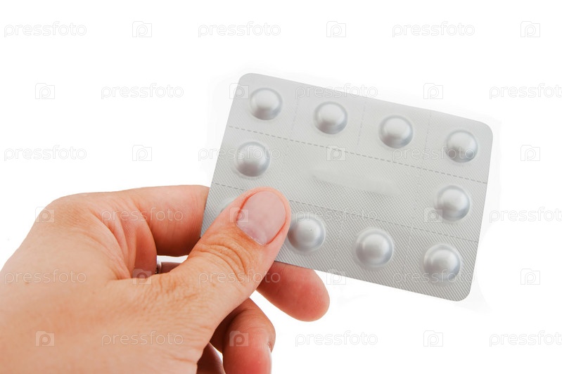 Человеческая рука и упаковка таблеток на белом фоне