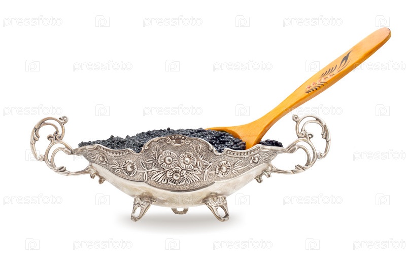 Черная икра в серебряном блюде на белом фоне