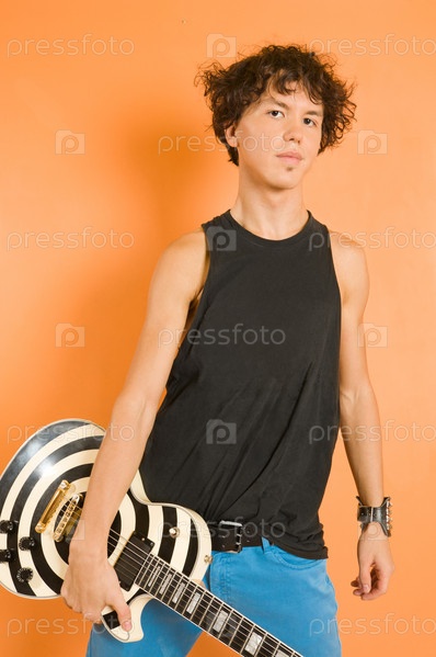 Портрет молодого рок-гитариста на оранжевом фоне