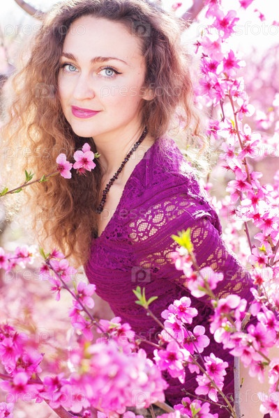 Красивая девушка в розовом цветущем саду