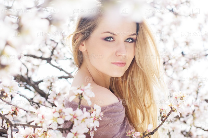 Красивая блондинка в весеннем вишневом саду