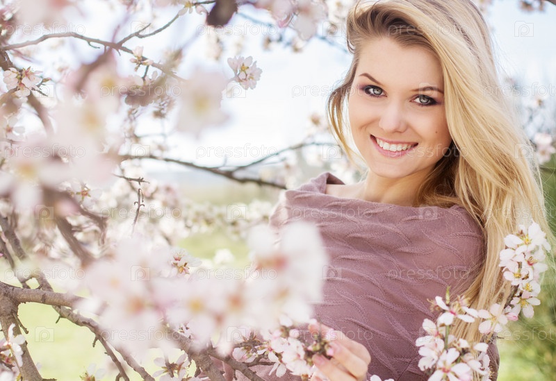 Красивая блондинка в весеннем вишневом саду