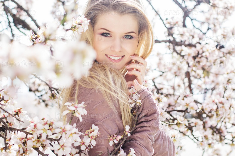 Красивая блондинка в весеннем вишневом саду
