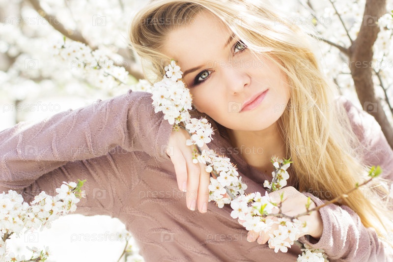 Красивая блондинка в весеннем вишневом саду