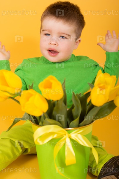 Маленький мальчик с букетом желтых тюльпанов