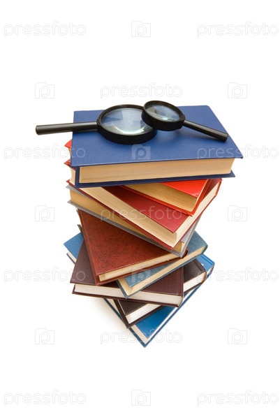 Стопка книг и лупа на белом фоне