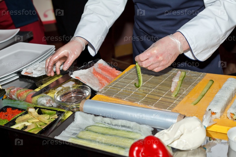 Шеф-повар готовит суши на кухне