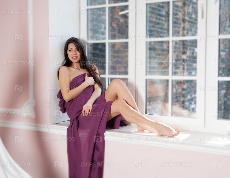 Женщина, завернутая в ткань, сидит на подоконнике