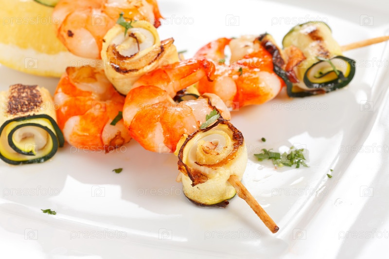 Креветки с овощами на шампурах