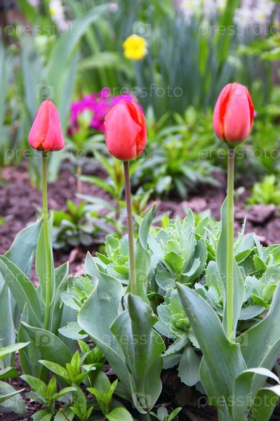 Три красных тюльпана на грядке в саду