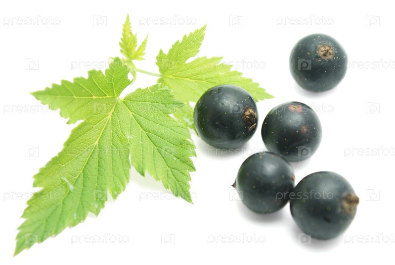 Черная смородина с зелеными листьями на белом фоне