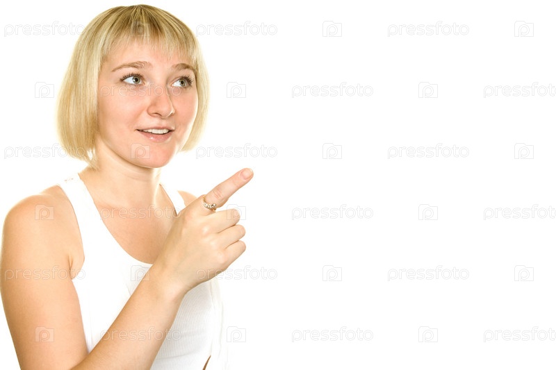 Блондинка показывает пальцем на белом фоне