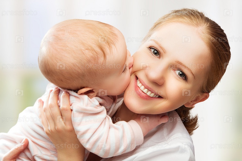 Счастливая жизнерадостная семья. Мать целует ребенка