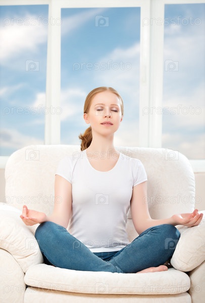 Женщина медитирует, сидя в позе лотоса, на диване у себя дома