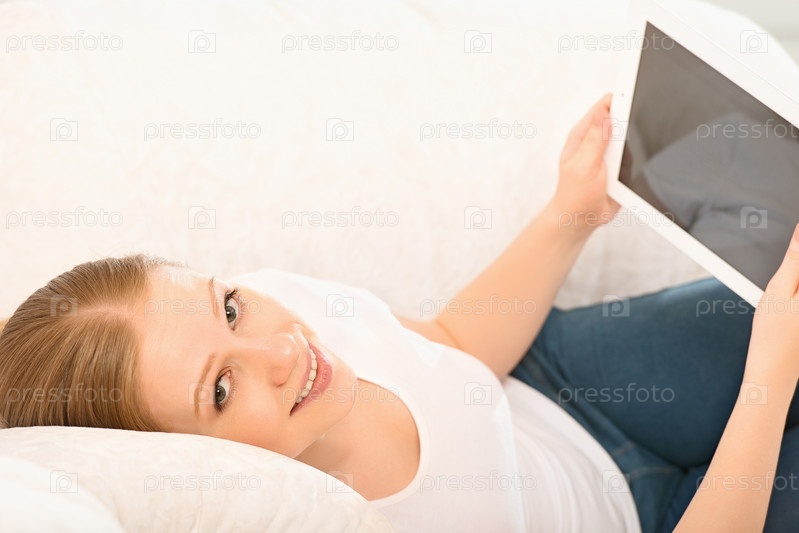 Женщина отдыхает дома с планшетным компьютером