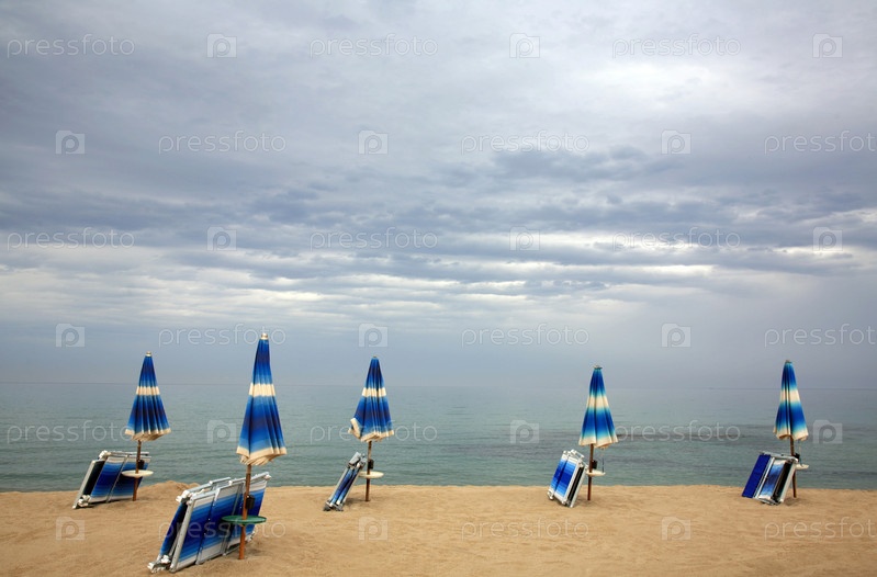 Романтический пляж с зонтиками и шезлонгами в Италии