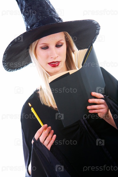 Симпатичная молодая блондинка в костюме ведьмы на белом фоне
