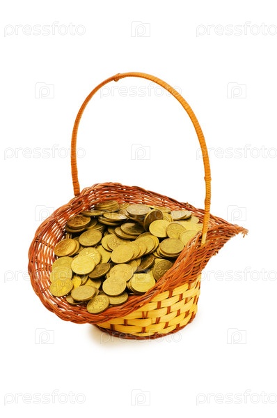 Корзина, полная монет изолированных на белом