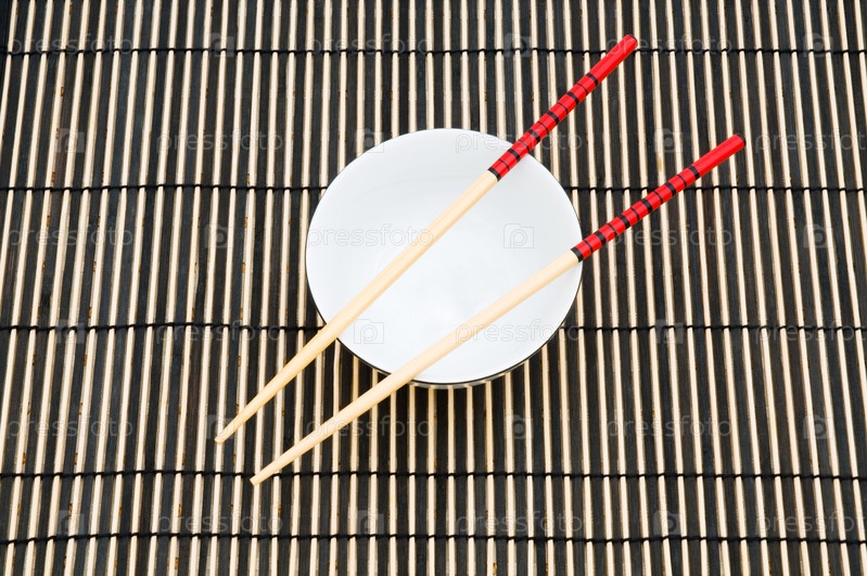 Палочки и чаша на бамбуковом коврике