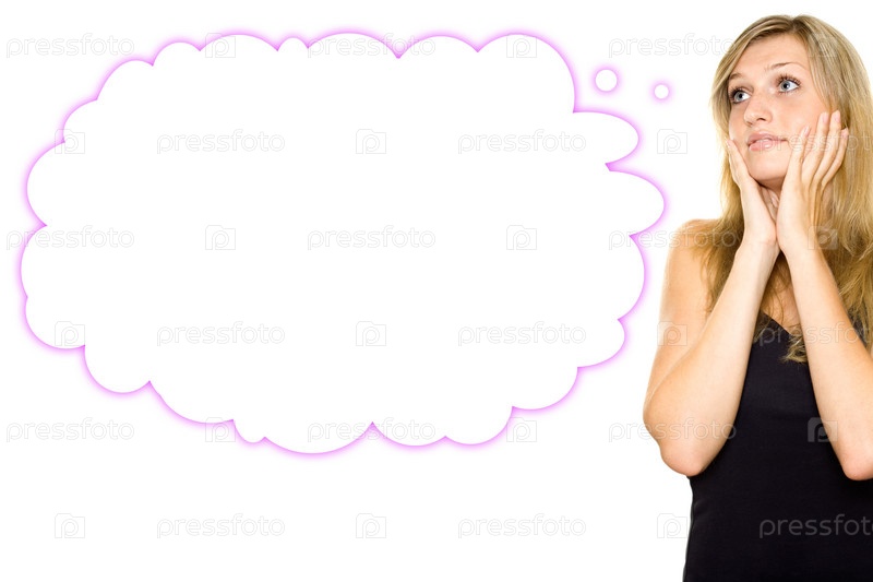 Задумчивая блондинка с мыслями на белом фоне