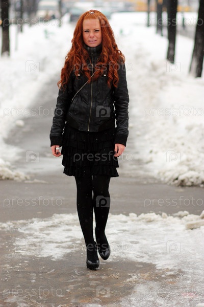 Красивая рыжеволосая девушка в зимнем парке