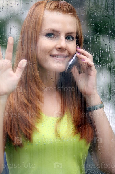 Девушка с телефоном за мокрым стеклом