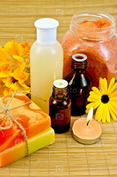 Масло и лосьон с цветами и свечой